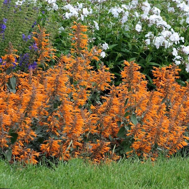 Agastache aurantiaca ‘Apricot Sprite’ (Hummingbird Mint) provides a sizzling blast of bright orange flowers during the heat mid-to-late summer. An outstanding perennial for attracting hummingbirds with brilliant fragrance. A great container plant; grow it as an annual if it is outside your growing zone.