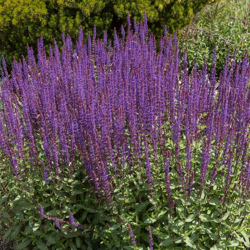 24″ tall x 18″ wide ‘Caradonna’ is unique with its tall, dark purple flower stems and rich purple-blue flowers, ‘Caradonna’ blooms for many weeks beginning in late spring. This particular variety thrives in a wide range of soils (including clay) and provides a strong vertical element with its uniformly upright flower spikes. Try it with lavender, ornamental grasses, or yarrow. It thrives with minimal care. Cut back to just above the ground in early spring. Remove the flowering spikes after blooming. A distinctive, award-winning cultivar developed at Zillmer Nursery in Germany. (cutting propagated).