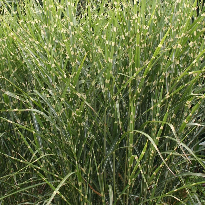 Miscanthus sinenesis ‘Gold Breeze’ (Zebra Grass Gold Breeze) is a stunning selection with unique horizontal bands of gold on the leaves and attractive reddish flowers tassels in late summer.