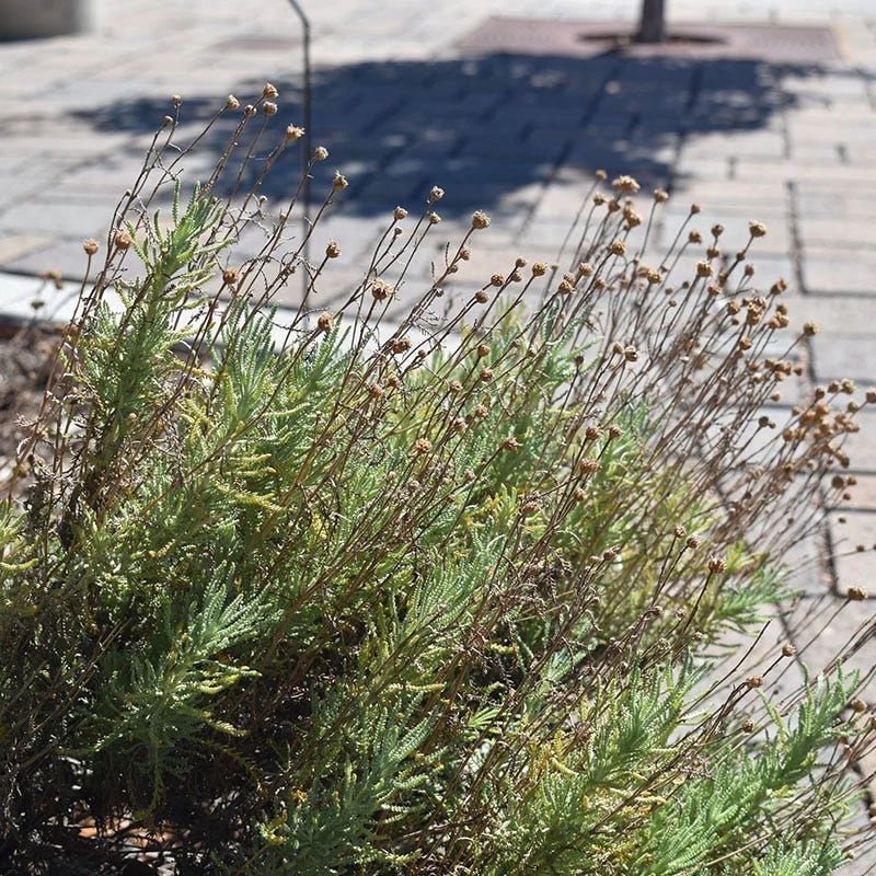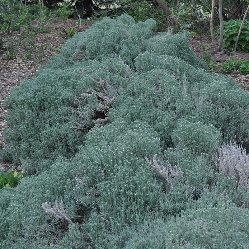 Gray Santolina (Santolina chamaecyparissus), is a wonderful Mediterranean herb with aromatic silver foliage that covers itself with hundreds of deep yellow button-shaped flowers in summer. The mounding evergreen foliage is an attractive groundcover that’s completely deer and rabbit resistant, and the fragrant foliage and flowers can also be used in sachets. Ideal for gardens with hot, dry summers, and full sun.