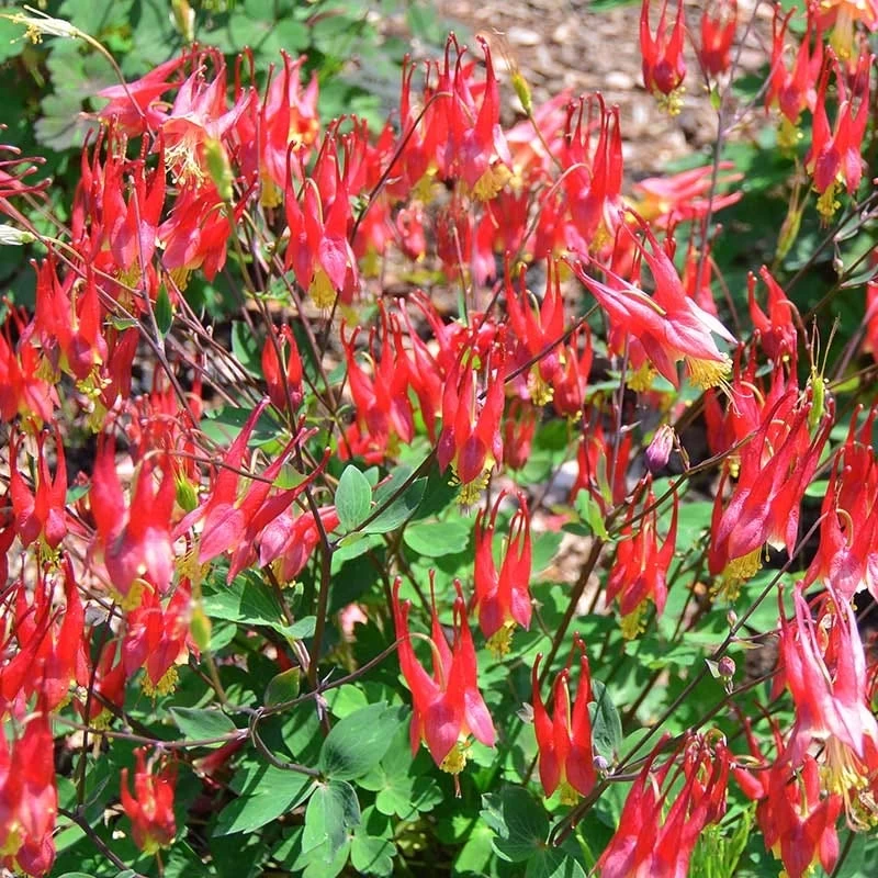 Little Lanterns is a dwarf selection of a columbine native to the Eastern US. The nodding bright red and yellow flowers appear in late spring and are magnets for hummingbirds.
